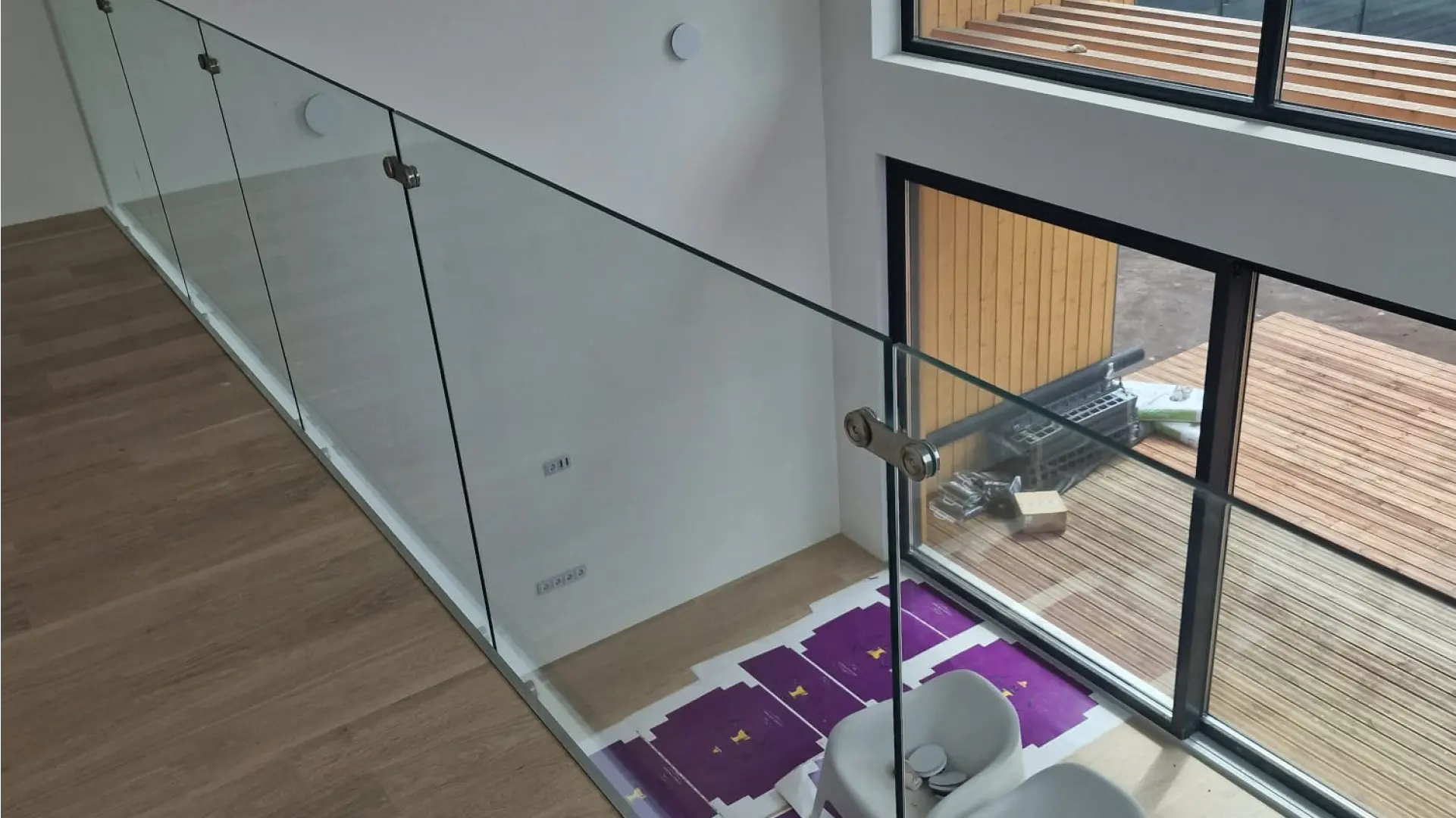 The interior reveals a polished and spacious environment with a glass balustrade that ensures unobstructed views within the residence, promoting an open and connected feel throughout the levels. High-quality materials and finishes are evident in every corner, from the warm wooden floors to the state-of-the-art fixtures.